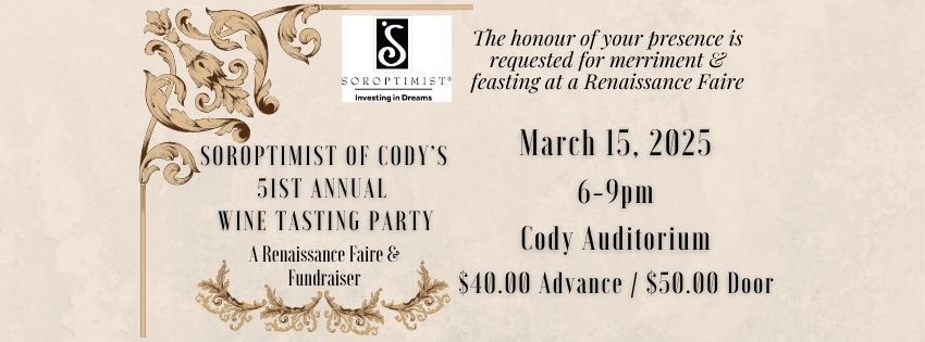 • Tickets: $40.00 in Advance, $50.00 at the Door. Tickets will be available soon ONLINE at: https://soroptimist-of-cody.square.site/ (WILL-CALL pick up the night of the event), or from Legends Bookstore, First Bank, Pinnacle Bank, or from any local Cody Soroptimist member.