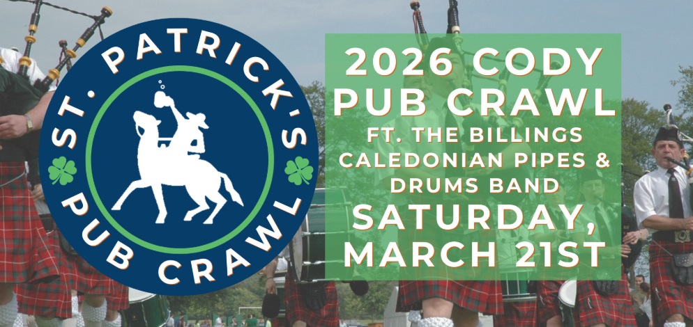 Come to the 2026 Pub Crawl in Cody, Wyoming for a drink and some Irish luck… Join the Billings Caledonian Pipes & Drums Band for this festive celebration on Saturday, March 21st! They’ll be piping & drumming across Cody’s hottest bars, lounges, and breweries starting at 4PM.