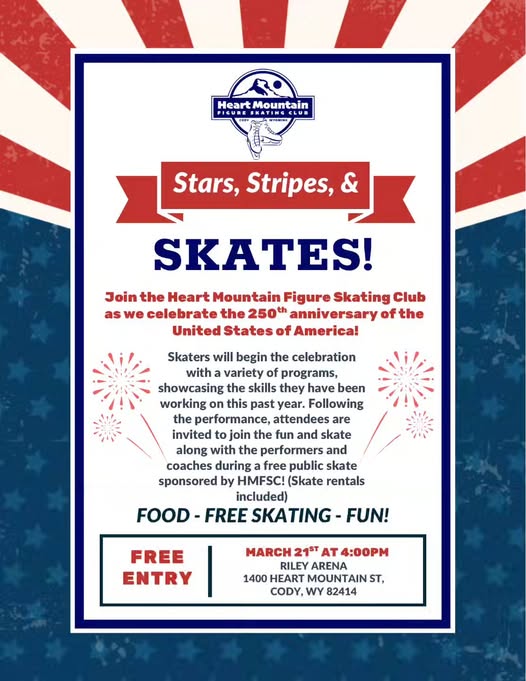 Join the Heart Mountain Figure Skating Club as we celebrate America’s 250th anniversary with a special skating showcase! Our skaters will perform programs highlighting the skills they’ve worked on all year.