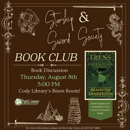 The Starship & Sword Society Book Club is now a permanent fixture at the Cody Library, meeting every 2nd Thursday of the month! 📚