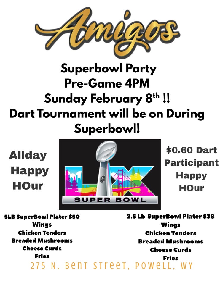 Super Bowl Party!! Wear your Favorite Teams Jersey, prizes all Super Bowl Long, Dart Tournament During, Multiple Prizes to win throughout the Game, Super Specials all evening Long. Plus Happy Hour During and after Super Bowl!! If you are playing in the Dart Tournament You will Have Happy Hour All Night Long!!