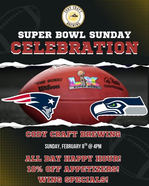 Super Bowl Sunday is a week away, and this is one you won’t want to watch from your couch! Join us at Cody Craft Brewing as the New England Patriots take on the Seattle Seahawks — with kickoff at 4:30pm and the party starting at 4:00pm.
