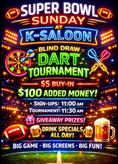 Home Super Bowl Sunday Organizer K-Bar Saloon Location K-Bar Saloon 219 E 1st Powell WY Category Holiday EventNight Life, Live Music & Concerts Date Feb 08 2026 Time 11:00 am - 8:00 pm Super Bowl Sunday Join us for a great time! Cody Journal advertisers make this calendar possible. + Add to Google Calendar + iCal / Outlook export 00 days 00 hours 00 minutes 00 seconds