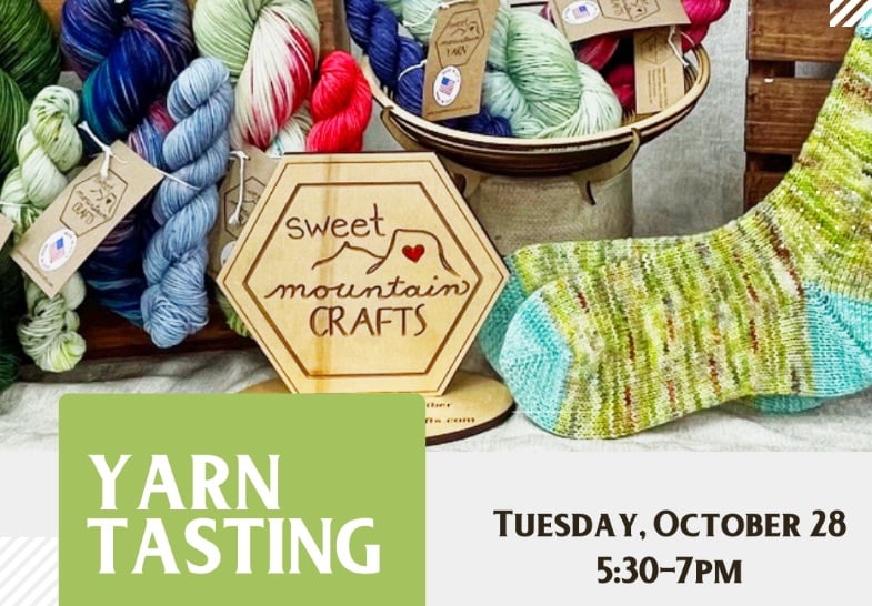 Join us for a fun evening of checking out new yarns from Sweet Mountain Crafts! This exciting event will include a goodie bag for each attendee, beverages, and food to enjoy. We will take a look at the new yarn bases, consider which yarns should be added to the Sweet Mountain Crafts lines, and even have a small selection of the new yarns available for purchase.