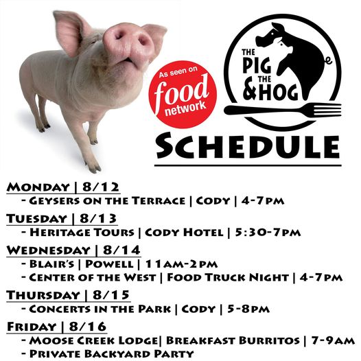 Home The Pig and The Hog Food Truck Organizer The Pig and The Hog Phone (303) 906-5241 Email [email protected] Website https://www.thepigandthehog.com/ Location Moose Creek Lodge 1015 Sheridan Ave Category Dining Date Aug 16 2024 Expired! Time 7:00 am - 9:00 am The Pig and The Hog Food Truck Cody Calendar advertisers make this calendar possible. + Add to Google Calendar + iCal / Outlook export The event is finished.