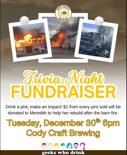 Meredith experienced a devastating loss when the barn that housed all of the essential equipment for her business, Wyoming Horsemanship Academy, was destroyed by fire. This Pint Night is about showing up for her. Grab a beer, play some trivia, and consider dropping a donation in the jar to help Meredith rebuild her barn and her business.