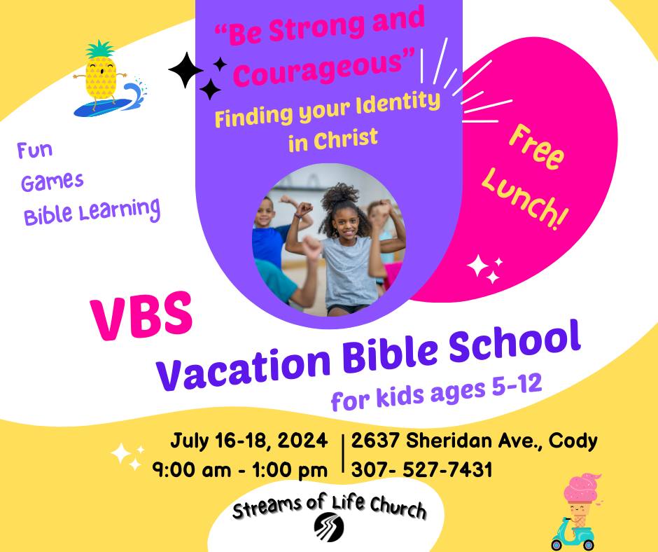 Home Vacation Bible School Organizer Streams of Life Church Phone (307) 527-7431 Website https://www.facebook.com/profile.php?id=100069749166680 Location Streams of Life 2637 Sheridan Ave, Cody WY Website https://codystreamsoflife.churchcenter.com/home Phone 307-527-7431 Category Churches Date Jul 18 2024 Expired! Time 9:00 am - 1:00 pm Vacation Bible School Tuesday, July 16th through Thursday, July 18th 9:00 AM – 1:00 PM Ages 5-12 Free Lunch! Cody Calendar advertisers make this calendar possible. + Add to Google Calendar + iCal / Outlook export The event is finished.