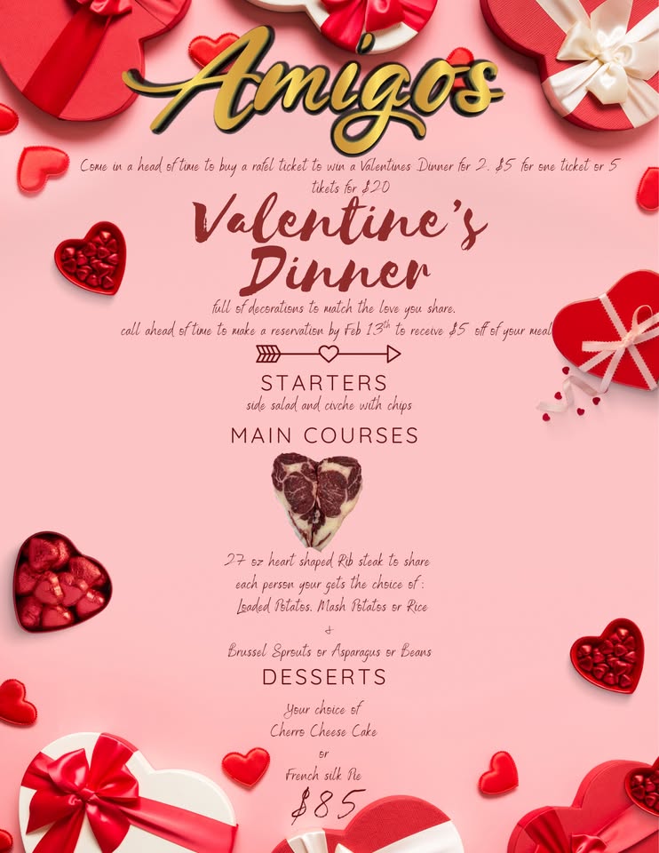 Heart Shaped Fancy Steak Dinner for Two. Amigos Decked out with Love. Come and enjoy Flavorful Local Cuts.