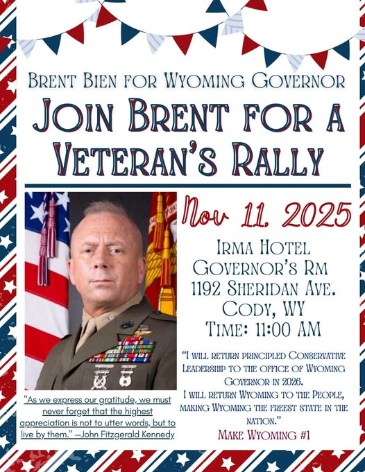 Home Veteran’s Rally Location The Irma Hotel The Irma Hotel | 1192 Sheridan Avenue, Cody, WY Website https://www.irmahotel.com/ Category GovernmentHoliday Event Date Nov 11 2025 Time 11:00 am Veteran’s Rally Join Brent Bien for a Veteran’s Rally. Cody Journal advertisers make this calendar possible. + Add to Google Calendar + iCal / Outlook export 00 days 00 hours 00 minutes 00 seconds