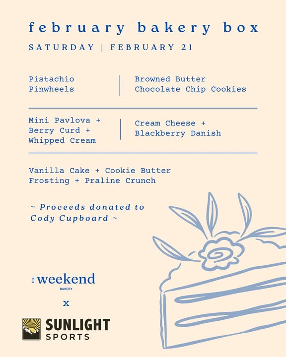 Rebecca from Weekend Bakery is doing something incredible – she’s donating all proceeds from her February 21st bakery boxes to Cody Cupboard, covering all her own costs, handling every detail, and asked us to simply host the pickup. This is community generosity at its best, and we’re honored to be part of it.