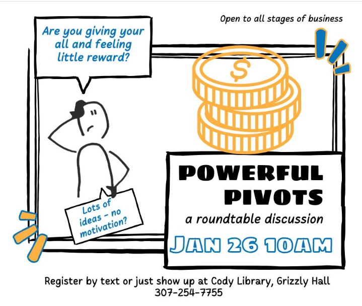 Devan-Costa-Cargill, Regional Director of the Wyoming Small Business Development Center, will be at the Cody Library on Monday, January 26 at 10:00 a.m. for a Roundtable Discussion: Powerful Pivots.