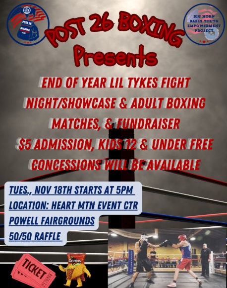 Join us for an action-packed evening as our Lil Tykes wrap up the year with exciting boxing matches and a special showcase — followed by adult boxing matches! Happening at Heart Mountain Event Center, Powell Fairgrounds, this family-friendly event will feature concessions, a 50/50 raffle, and more!