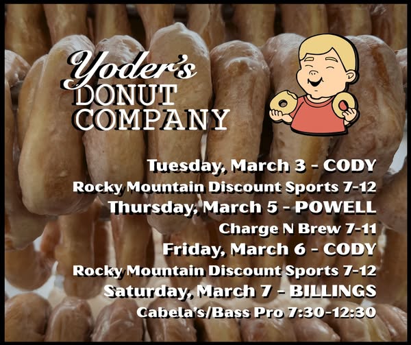 Home Yoder’s Donut Co. Food Truck Organizer Yoder's Donuts Phone (307) 254-1352 Email [email protected] Website https://www.facebook.com/profile.php?id=100091395670338 Location Rocky Mountain Discount Sports Rocky Mtn Discount Sports | 1526 Rumsey Ave, Cody Wyoming Website https://www.rocky-mountain-sports.com/ Category Dining Date Mar 03 2026 Time 7:00 am - 12:00 pm Yoder’s Donut Co. Food Truck Join us for donut goodness! Cody Journal advertisers make this calendar possible. + Add to Google Calendar + iCal / Outlook export 00 days 00 hours 00 minutes 00 seconds