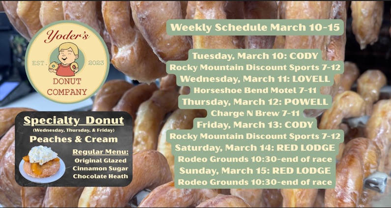 Home Yoder Donuts Food Truck Organizer Yoder's Donuts Phone (307) 254-1352 Email [email protected] Website https://www.facebook.com/profile.php?id=100091395670338 Location Rocky Mountain Discount Sports Rocky Mtn Discount Sports | 1526 Rumsey Ave, Cody Wyoming Website https://www.rocky-mountain-sports.com/ Category Dining Date Mar 13 2026 Time 7:00 am - 12:00 pm Yoder Donuts Food Truck Schedule for the week. Cody Journal advertisers make this calendar possible. + Add to Google Calendar + iCal / Outlook export 00 days 00 hours 00 minutes 00 seconds