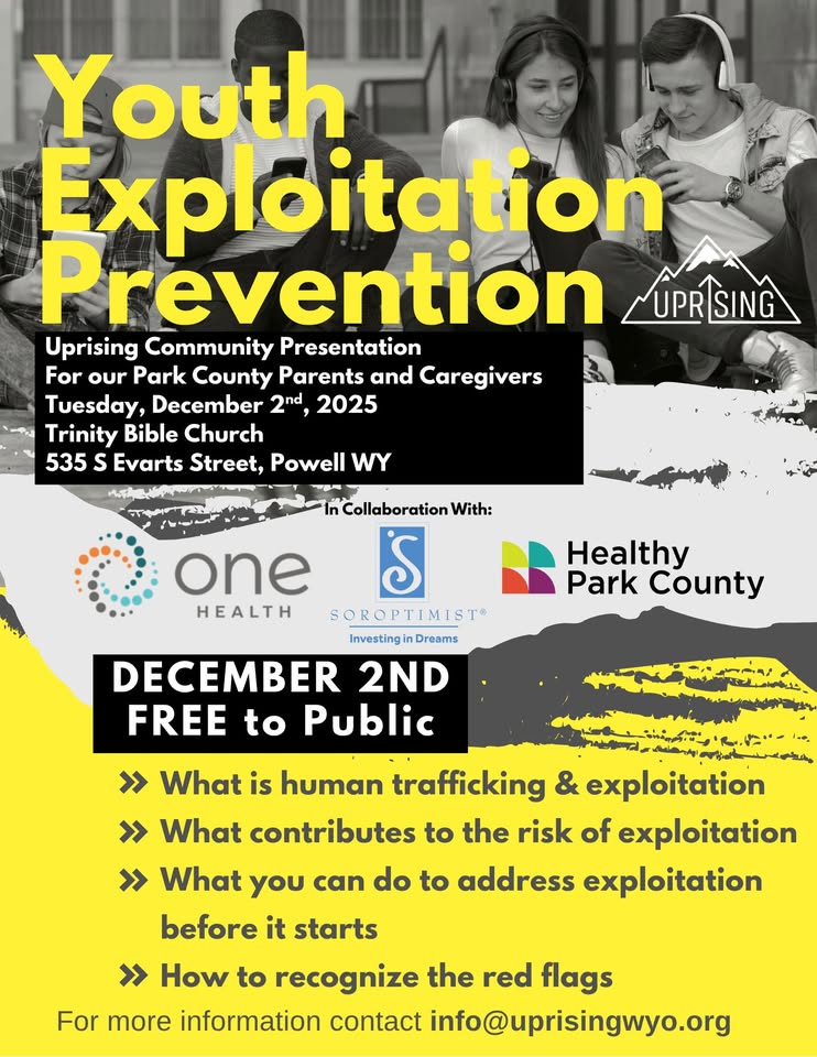 Join us on December 2nd for a FREE Youth Exploitation Prevention presentation with Uprising, in collaboration with One Health, Soroptimist, and Healthy Park County.