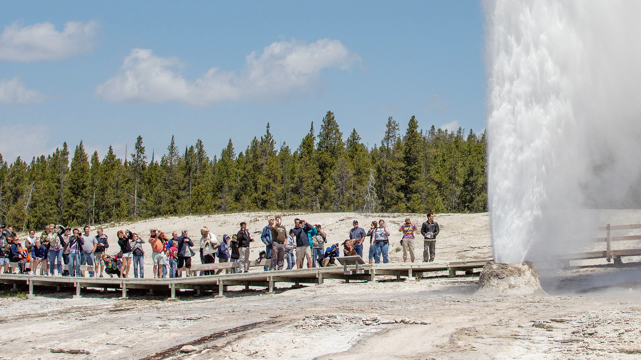 Visitors enjoying an eruption of Beehive Geyser in Yellowstone | © Janet Jones – SnowMoon Photography