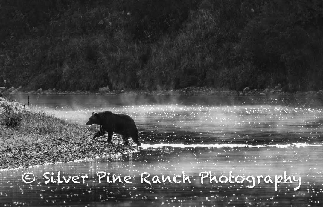 The sun was coming up and adding little pin points of glistening light to the fog covered river, looking light little fairy lights. She gracefully left the river like a Goddess, draining water off of her beautiful grizzled coat as she walked up the hill. We eagerly awaited her “shaking off” the river water like a dog, as we watched her progress. Poised and ready for the action, we were disappointed to see her partly disappear behind a small evergreen and do it there where we couldn’t get the shot. There were only four of us there watching her at the time, and will be a rare moment in time I will always cherish.